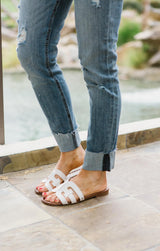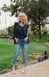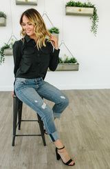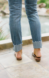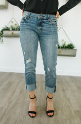 The Catherine Boyfriend Raw Hem Cuffed Jean is a chic, versatile and classic addition to your wardrobe. The distressing on the front and raw hem on the cuff add a touch of chic to your look. Dress them up easily by pairing with a blouse, blazer, and heels or down with a t-shirt and your Chuck Taylors or Vans for a great casual look.
