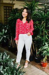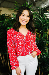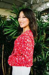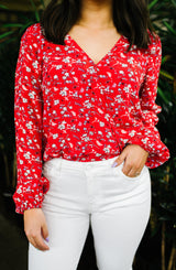 A beautiful, versatile for your wardrobe. The bright red color, floral print, blouson sleeves, and wrap look fit the demands of any occasion. Simply pair it with jeans and heels for a casual chic look or transition it to a pair of trousers or a skirt for the office. The options are limitless with this one and will help it quickly become one of your favorites! **FINAL SALE**