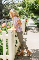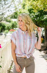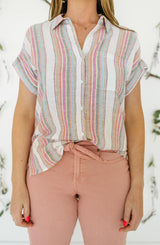Add a pop of color to your day with the Edison button up. The short cap sleeves make this a great option for those who want a short sleeve but not a sleeveless top. The Edison can easily be paired with pastel trousers, like our Tate Mid Rise in pale blue or our favorite, KUT cropped wide leg. These look fabulous with denim jeans and our Helen Trouser short in parot green. With a high low hemline, button front, and pocket detail, this top can be worn to the office or on your weekend adventures. Versatility is key with this top.**FINAL SALE**