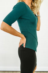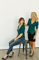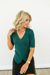 **Final Sale** A beautifully simple, versatile top, this faux wrap design will work for almost any occasion. The beautiful emerald color is great for spring and the angled cut on the hem adds a fun detail that sets this one apart from your typical blouse. Paired with your favorite jeans, skirt, or trousers, this top can go anywhere you need it to and the flattering deep v-cut neckline is sure to make you feel sexy and confident!