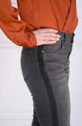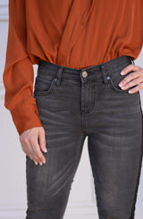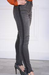 A dark denim that is not your typical black jean. No, the Gisele Ankle Skinny by Dear John denim is an amazing pixie color which is a distressed black that ends up being a fabulous dark grey. But the details do not end there, we are in love with the black side stripe that runs from waist to hem. Speaking of hem, we love the raw, distressed details. The hem adds some flare to these not-so-basic skinny jeans. We love these paired with a blouse and moto jacket for date night or casual Friday at work. For the weekend, we love these jeans paired with an oversized, off-the-shoulder sweater and booties.