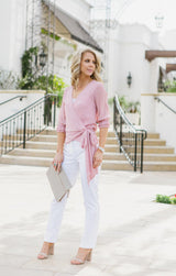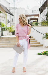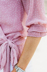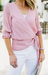 Now that's a wrap! This gorgeous, light weight, beautifully blush polka dot wrap blouse is the perfect pairing for any spring or summer day. With billowy 3/4 length sleeves, fun ruffle cuff detail, and wrap front design, this blouse is romantic and ultra feminine. It can be worn to the office with a pair of Nic + Zoe white trousers or our favorite "perfect" pencil skirt. Or... pair it with your favorite denim and flat sandals. Wear it to brunch or the office. This blouse is feminine yet flirty. **FINAL SALE**