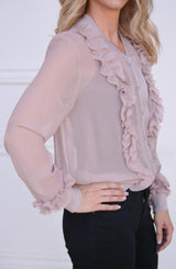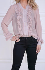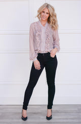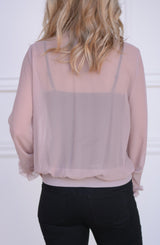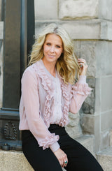 Bomber jackets are so on trend which is why we are loving the details of this Ruffle Blouse Bomber. Can double as a blouse or transition to a light jacket. With a full button front and elastic cuff and hem detail, it looks like a bomber jacket, but the fabrication and ruffle details scream blouse. The ruffle detail runs the full length of the bodice, flanking the center button closure. Pair with denim and sneakers for an edgy look, or layer with a collared blouse and trousers for the office.