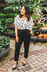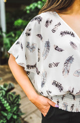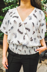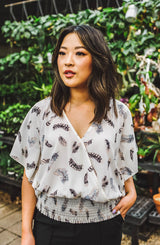 A great flowy top that is a truly versatile piece. Pair it with a pencil skirt or trousers for an office chic look or create a sexy polished casual look with a pair of jeans and heels. The flutter sleeves have a side panel so the top is not open on the sides. It also features a bunched elastic waist for a nice, flattering fit. The faux wrap gives an added detail and has a stitch closure to keep things in place. **FINAL SALE**