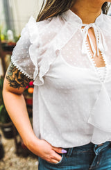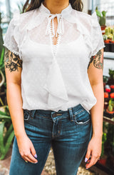 There is nothing like a great white blouse and this Swiss Dot blouse does not disappoint. With fun ruffle details on the sleeve and fun dot v-neckline with tie, this blouse offers a bit of fun without being too over the top. This blouse looks fabulous with the our Baxter crop trousers for the office and easily transitions to date night with the husband. Pair this blouse with the Faux suede mini skirt for a fun and flirty look or white denim and bright colored heels. This top offers versatility and fun. **FINAL SALE**