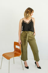We are obsessed with these Katie Paper Bag Pants by KUT. A high waist with tie belt and pleated front make these pants incredibly flattering on the waistline. The relaxed fit from the hip down, and cropped wide-leg make these pants a spring through fall essential. The fit along with the gorgeous olive color make these pants a classic that can be worn for years to come. For the office, pair these pants with the Allison button down blouse and nude heeled sandals. For after hours, pair these trousers with the blooming eyelet off-the-shoulder blouse by Sanctuary. For the weekend, we love these pants paired with a simple racer back tank and flat sandals or sneakers. Office to ball field, these pants have you covered.
