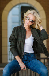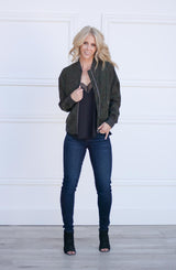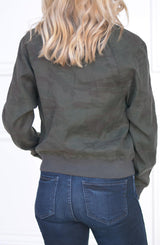 Why blend in when you can stand out in this amazingly versatile Remy Linen Camo Bomber. In Midnight camo, the print is extremely subtle, but do not let that fool you as you will get asked "where did you get your jacket"? With classic bomber style details such as full front zip, elastic collar, cuffs, and hemline, this jacket is the "bomb...er". See what we did there? Pair this bomber with our lace trim camisole, paperbag trousers and heeled booties for the office, then ditch the trousers for distressed denim and sneakers for the weekend.