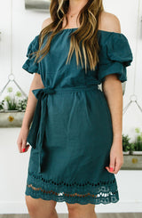Get some sun on those shoulders and look perfectly chic in this lovely off-the-shoulder dress eyelet dress. The puff sleeve details give this dress a little something, while the off-the-shoulder neckline adds a bit of sass. The removable tie waist and feminine eyelet hem detail make this a classic choice for any spring or summer occasion. We love this dress paired with an over-sized hat, rattan bag, and espadrilles. Going to a wedding, then pair this dress with open toe heels, statement clutch and layered necklaces. Looking for a more casual look, remove the tie and turn this dress from a midi to a shift dress and then pair with some sneakers or flat sandals. Simple and fun, this dress has you covered. **FINAL SALE**