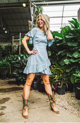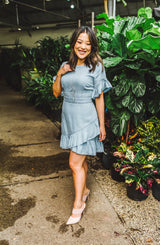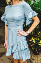 Say hello to spring and all of your summer parties with this Indigo Ruffle dress. With flattering rounded neckline, feminine ruffle sleeves, waistband detail that is ultra figure flattering and angled ruffle hem, this dress can be dressed up or dressed down for any occasion. Think 4th of July and cowboy boots with this cutie! Oh, did we mention the fabric is lightweight and ultra soft tencel? This means you can wear it all spring and summer long and you won't over heat. **FINAL SALE**
