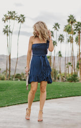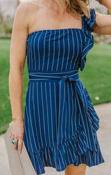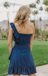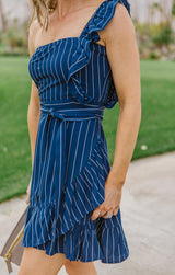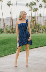 The So One-Sided Shift dress is a sexy spring or summer essential featuring a ruffled one shoulder style with great ruffled skirt detail and waist tie. The navy and white pinstripe fabric makes this dress suitable for any occasion. **FINAL SALE**