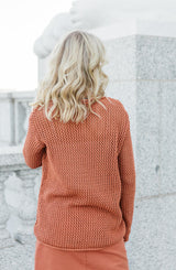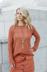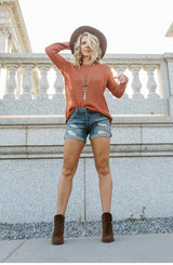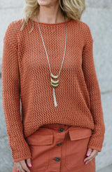 The perfect transitional piece from summer to fall. This sweater has a nice weight, but the open knit makes it not too overly hot. Pair this sweater with a pair of distressed denim shorts or jeans. Features a rolled neckline and hem.