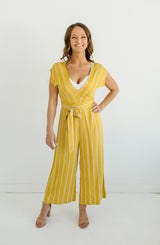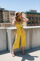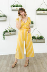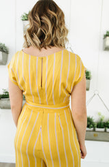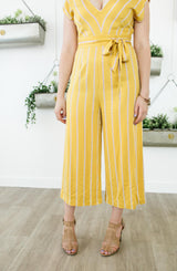 Show off your moves with the All The Right Moves Sunset jumper by BB Dakota. We are crushing on the sunset yellow color but it doesn't stop there. The v-neckline, wide shoulder straps, tie belt waistline, keyhole back design, and cropped wide-leg bottoms make this a perfect office to event piece. The stripe pattern offers a bit of detail and flattering details. Let's not forget about the light weight, soft rayon material. It's perfect from Spring to Fall. Pair this jumper with a pair of stacked heeled sandals for the office, and then for the weekend, an oversized hat, flat sandals, and ratan handbag. Perfect for travel and is versatile for any occasion. **FINAL SALE**