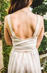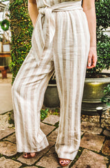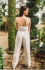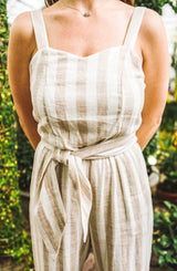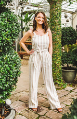 A perfect spring and summer travel essential. One of the most popular jumpsuits we have sold, this body style is flattering yet incredibly comfortable. The lightweight linen material is breathable, however, the fun cross back that wraps around to tie in the front, gives this simple jumper a little "something" special. The jumper features 1" straps, subtle-sweetheart neckline, cross back with front tie closure. The jumpsuit is fully line, giving you piece of mind. **FINAL SALE**