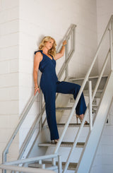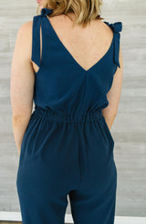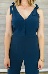 Turn heads with this Topeka jumpsuit. A wardrobe classic with fun details including double v-neckline, functional front buttons, and tie shoulder straps. This jumpsuit is incredibly chic with the classic lapis blue color, crepe like material, and wide-leg. Pair this classic jumpsuit with heels, simple necklace, and clutch. Simple, polished, and chic. **FINAL SALE**