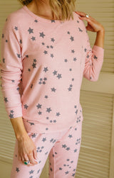 This Peachy Party long sleeve is the perfect choice for curling up with a good book and a glass of wine or binge watching your favorite show. Available in blush with smoke star detail or in smoke with fun martini glass detail. Once you put it on, you won't want to take it off!