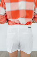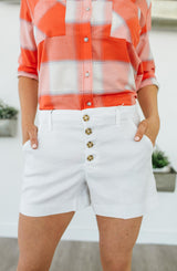 Step into spring with the Lyndie button front shorts by Level 99. Finding a lightweight linen white short that is cute and not see through is difficult, but these shorts check all the boxes. With nude internal pockets to match your skin tone, faux turtle shell exposed buttons, angled side pockets, and lightweight yet comfortable linen material, we are crushing on these shorts. Wear them on date night with our Flowerland off-the-shoulder blouse and wedges, or for a more casual look, pair these shorts with our Malibu sleeveless muscle tank and sneakers. These shorts are a classic and will last for years to come.