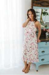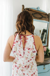 Whimsy with a touch of charm, that is how we would describe this Keepsake Floral dress by Kensie. The neckline ties in the back to review a gorgeous keyhole design, while deep red floral piping on the shoulders adds a bit of depth to this dress. The white flowy, material is feminine as is the red, blush, and taupe floral pattern. There is a delicate ruffle on the waistline as well as on the high-low hem. Pair this dress with a nude sandals and a clutch. Simple and chic, this Keepsake Floral dress is just that, a keepsake. **FINAL SALE**
