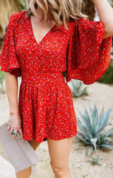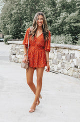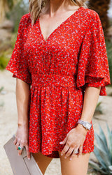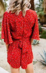 Picture yourself traveling wine country or walking the cobblestone streets of Venice in this tiny floral printed romper. With flattering flutter sleeves, a v-neckline, and a tie waist belt. This will sure be a fun, spring essential for the weekend warrior or world traveler. **FINAL SALE**