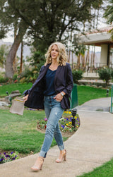 Think power suit but more stylish. This 3/4 sleeve pinstripe blazer is anything but ordinary. With tie details on the sleeves and a subtle tan pinstripe, this blazer can be paired with trousers, distressed denim or pencil skirt. This blazer pairs well with our gorgeous camisole bodysuit and your favorite trousers or distressed denim and a v-neck t-shirt. Versatility and style collide with this dream blazer.