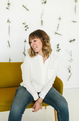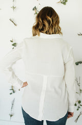 Everyone needs a basic white long-sleeve blouse in their wardrobe. They are so versatile. Wear it to the office or out on errands. This button up top by JACK is great for spring and summer. The material is a soft crepe cotton with waffle like texture. This blouse buttons half way in front and has a single pocket and in the back, there are fun button details on the hemline. This top looks amazing when paired with skinny jeans, a half-tuck, and wedges. You can also wear this top with our Baxter cropped trousers for an office chic look. **FINAL SALE**