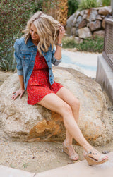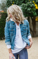A fresh take on an iconic look, this fitted denim jacket is crafted slightly distressed, finished with copper buttons. A touch of spandex makes this jacket comfortable to wear. A versatile piece and a wardrobe essential. This jacket can be worn to the office to the weekend with your favorite athleisure apparel. Pair this jacket with a pair of wide leg trousers, camisole, and heels for the office, then layer with your favorite sweatshirt and leggings for the weekend. Denim jackets are on trend and you will fall in LOVE the Amelia.