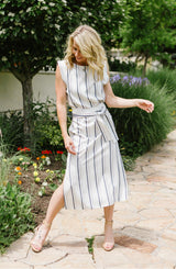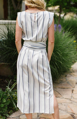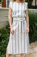 Do not pass this dress by. It may not be flashy, but it has details that are figure flatting. The boat neckline and wide semi-cap sleeves accentuate all the right places, while the tie belt wraps delicately around the bodice twice, giving you a cinched in waistline. The straight skirt with slit detail adds a little sex appeal while keeping it office appropriate. We love this dress paired with simple heels and statement earrings. Out of the office, wear this with the Amelia denim jacket and sneakers. Easy, breezy look! **FINAL SALE**