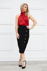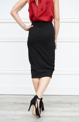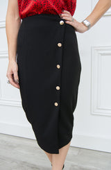 Two words...button details. Yes, this is the skirt for you. Whether you head to the office or you love a good skirt for church, this skirt has you covered. The classic black color is fabulous year-round, not to mention the amazing angled gold buttons the run from the waistline to almost the hem. The wrap design gives more detail to this already fabulous skirt. We love this skirt paired with the Tie Neck Top for your next holiday gathering. For the office, pair this top with the Denali Printed Blouse and heels. For a more casual look, pair this pencil skirt with an oversize sweater, french tuck, booties, and a fedora.