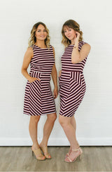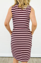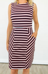Panels, stripes, and everything nice. This Cabana Panel dress is ultra figure flattering and a wear to work essential. The details are endless with this dress and it will sure to impress! This sleeveless dress hugs all the right places without being too tight. The red, navy, and white stripes are classic, yet the various panels on the front of this dress create a fun pattern from horizontal, vertical, to angled. With a slight empire waistline, center panel inset, and diagonal pockets on the hips, this is not your basic A-Line dress. Throw on a red blazer and navy heels for the office or wear alone with open-toe nude heels or flats. Heading on vacation? Pair with a denim jacket and sneakers. Oh, did we mention this is machine washable and does not wrinkle? Bonus! A classic dress with fun twists! **FINAL SALE**