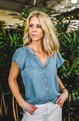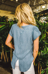 A soft denim shirt that can be dressed up or dressed down, yes please! The Sanctuary Charmer Button Front is perfect transitional piece. With subtle dot print detail, flounce sleeve, and a high low hem with a back hem slit detail this top adds a little spice to an ordinary denim shirt. The material is a lightweight tencel material, great for spring and summer as well as office to the ball-field. We love this blouse paired with our Nic + Zoe white trousers for the office, and then our Sanctuary Peace Crop white denim pants for the weekend. *FINAL SALE*