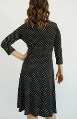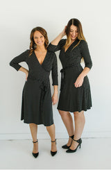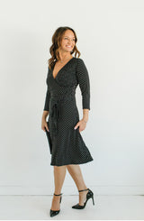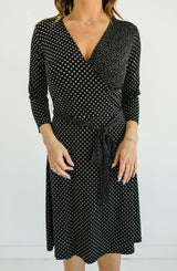 This dress is "spot on" A perfect office to event dress. We love the wrap design because it is universally figure flattering. The v-neck design and variegated dot pattern adds a fun detail. The Classic Dot Wrap also has 3/4 sleeve, which we are in love with as it adds the perfect amount of coverage. The skirt length is not too short or not too long, hitting right at the knee. What we like most about this dress is that it travels well as it does not wrinkle and is machine washable. Wear this dress with a simple necklace and heels for work. For an event, we love this paired with fun statement earrings, a bold clutch and fun heels. **FINAL SALE**