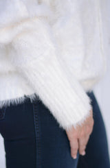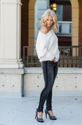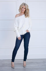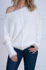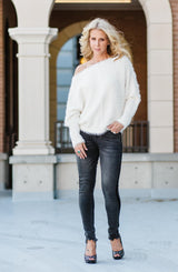 Take the comfort of a soft blanket and warm fire and spin that into a gorgeous sweater. The wide, boat neckline can be worn on the shoulder creating a cowl neck, or off the shoulder for a sexy, cold-shoulder look. We are crushing on the faux fur details on this sweater and the relaxed, dolmen sleeve makes it a chic, effortless look. Wear to the office with trousers and simple pearls. For the date night, pair with denim, over-the-knee boots, and long necklace.