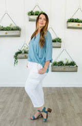 Casual, cool, and versatile, this criss-cross long-sleeve is everything! The fabric is incredibly soft, but what's truly special about this top is the blousey criss-cross design in front and step hem in the back. This blouse pairs beautifully with white denim or white linen wide-leg pants. However, it can also be worn with our Catherine distressed boyfriend jeans and sandals. Dress this top up by pairing it with our Nic + Zoe white trousers or a simple pencil skirt. **FINAL SALE**