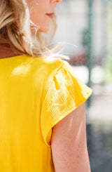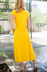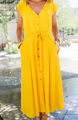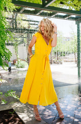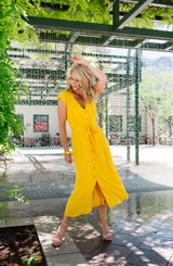 Bring on the sun in our Eden Button Front Dress. The perfect midi for your next garden party, baby shower, or wedding. With a gorgeous lightweight, rayon crinkle fabric that has amazing flow, coupled with a full button front, removable tie belt, flounce sleeves, and what every women loves, POCKETS. This dress is sure to please. We love removing the tie belt and paring it with your favorite wide belt for added drama. The Eden Button Front is a chic boho style for all occasions. **FINAL SALE**