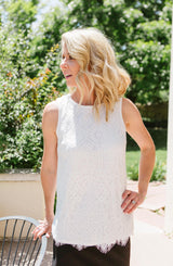 Own the office with this fun eyelash lace tank. Dress up or dress down, this tank is great for any occasion. With rounded scoop neckline, wide tank straps, and delicate lace overlay with eyelash detail on the hemline, this tank looks amazing paired with our Perfect Pencil skirt for the office. For a non-skirt option, pair this tank with our blush high-waist paperbag trousers. For the weekend, combine this feminine top with a pair of distressed denim. We love this top paired with our Catherine Boyfriend jeans by KUT from the Kloth. Not in to distressed denim, no worries, pair this top with our Level 99 linen shorts. **FINAL SALE**