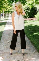 Looking for a pant that is not only comfortable, does not wrinkle, is travel friendly and provides all-day resiliency and shaping? Then say hello to the Flare Slit Crop. This pant features pull-on styling, a concealed waistband and fabulous lower leg slits! The pant skims the hips and thighs before falling into a flowy, open hem. This is the perfect versatile pant. Pair it with a blouse, sweater, trench coat, kimono for the office. For the weekend, throw on one of our graphic tees, denim jacket and some vans for a extremely comfortable all day fit.