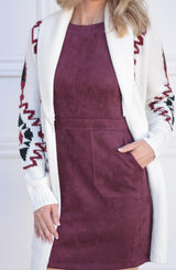 You will want to rush into fall to wear this dress. It is as fabulous as it is stylish. The Gemma is a faux suede sift dress that has endless details. To begin, the front square pockets, faux suede material, waistline panel detail, and exposed zipper in back. We love this dress paired with the Aztec cardigan sweater and over-the-knee boots. This look is fall chic and will soon become your go-to dress of the season.
