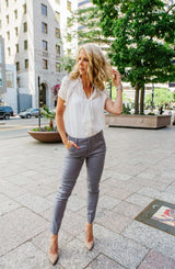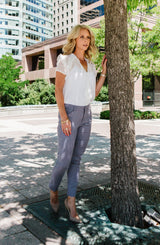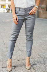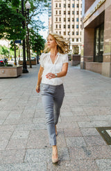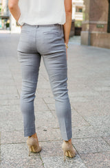 Where a classic slim trouser meets the comfort of a linen blend. Meet the Kellie Slim Trouser! This trouser is the perfect work to weekend essential. The Kellie Slim Trouser offers classic design with a slim fit through the hip and thighs and lands at the ankle. The side slant pockets offer a seamless look without creating extra bulk. These pants have a front zipper and hook and eye closure. Wear these to the office with our Swiss Dot short sleeve blouse and heels. For the weekend, cuff the hem, throw on a graphic tee, our Amelia denim jacket, and sneakers. These trousers are comfortable and functional, work to weekend.