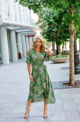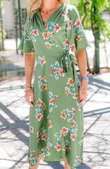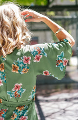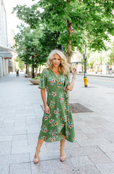 A true wrap dress that is chic and conservative, the Orna Wrap Dress by Bobeau is a best seller each season. The beautiful bold green floral makes a statement, while the flutter sleeve, v-neckline, and midi skirt offer sophistication. We adore the true wrap feature which allows you to adjust the fit. The skirt is partially lined to the shortest point in the high-low hemline. Wear the Orna to work, a wedding, baby shower, church, or your next special event. **FINAL SALE**