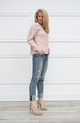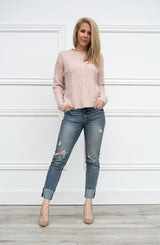 Who doesn't enjoy a good cable knit? We sure do and the Pinkie Cloud Cable Knit Sweater is truly a classic. The details are endless with this sweater. The Pinkie has a classic crew neckline and fun cable knit pattern. The drop shoulders give this sweater a more relaxed feel and look. For the office, we love the Pinkie paired with a simple pencil skirt or skinny trousers. For the weekend, we love pairing this sweater with our Catherine Distressed jeans and sneakers or booties.