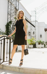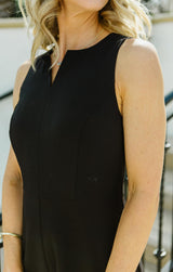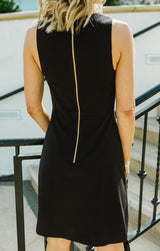 Simple yet classic, this A-line sheath dress is an office staple. The round neckline with V-slit, sleeveless construction, and fun exposed back zipper makes this sheath dress easy to wear to the office or brunch with your best girlfriends. This dress pairs well with our crepe blazer and heels for the office or dress it down by adding a denim jacket and sneakers.