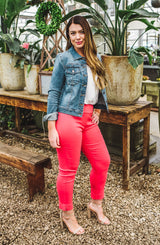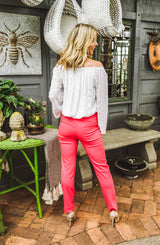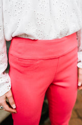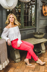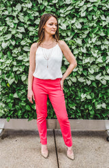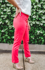 Looking for a no-fuss trouser that you just slip on and go? Look no further, the Tate Low Rise is the pant for you. Fitted through low waist and hip, these trousers are a real standout with the bright, fun colors and straight-legged, classic style. Complete with rear pockets and left-front mini pocket, they are comprised of easy-care Rayon Twill. Pair them with our ivory City Proper sleeveless blouse and heels or rock the bright pink with our camisole bodysuit and new favorite Rio moto jacket in ivory. On the weekend, pair these trousers with a fun graphic t-shirt and sneakers! **FINAL SALE**