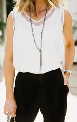 The perfectly versatile tank to add to your wardrobe. The rounded v-neck and mesh detail front and back add a sexy flair to a classic staple. Pair this tank with your favorite trouser, slacks, or pencil skirt and heels for the essential office chic look. It is also easily paired with your favorite ripped jeans or shorts and sandals for a go-to polished casual ensemble.