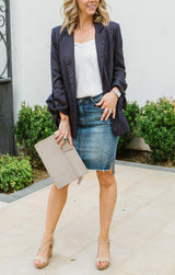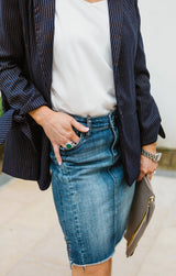 The Connie Step Hem Skirt features frayed step hem detail with subtle distressing on the body of this faded jean skirt. Perfect for any spring or summer look, this skirt is an essential for your wardrobe. Pair it with a graphic tee, tank, or our favorite navy striped blazer, camisole and wedges for a polished casual look.