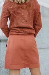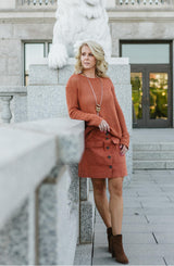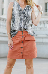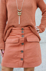 A great casual skirt in the perfect autumn color. The Desert Skirt is one of our favorites with its large button-front detail with large utility-style pockets in front. Pair with a graphic tank or tee during the last warm days of summer or pair it with a sweater for those cool fall days. Any way you pair it, you are sure to love this great skirt!