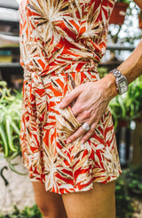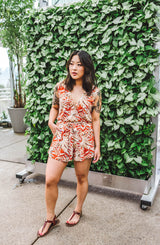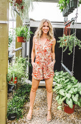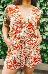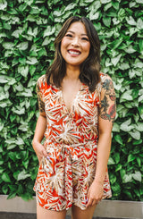 We are in love with this adorable Donna Romper. Made from an ultra comfy stretch fabric by Veronica M, you will love wearing it! This romper features a faux wrap with a snap closure, elastic waist with a delicate tie. The great palm print is great for a vacation essential, or a girls' night out! *FINAL SALE*