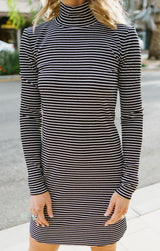 An absolute essential for any wardrobe, this mock neck midi-dress offers versatility, comfort, and style. This dress is a fitted ultra-soft midi dress detailed with subtle rib knit and finished with a rounded rem. With full-length sleeve and breathable material, you can easily wear this to the office and on the weekend. Pair it with black heeled sandals and a leather moto for the office, then ditch the heels for a pair of white leather tennis shoes and a sweatshirt wrapped around your waist. This dress will become your go-to for weekend adventures. **FINAL SALE**
