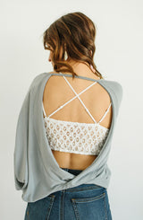 Looking for a fun sweatshirt to throw on after getting your yoga flow on or just to look cute lounging around the house? This open-back sweatshirt is the perfect choice with its asymmetrical hem that is slightly cropped in the front and unique open-back design, its sure to quickly become one of your favorites.