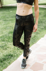 You will not blend in with these Black Camo Leggings. Your running session just got stylish.These leggings will support you through all your days activities from spin class to your favorite HIIT routine to a trip to the grocery store, these have you covered. The body shaping waistband is supportive but not constricting. The raw hem construction allows you to hem to your desired length or keep as is, your choice. But what we love most about these leggings is the form and function. Not only will these leggings take you through your latest CrossFit routine, the luxurious fabric is the perfect athleisure item, going from gym to nightclub if you choose.