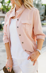 A lightweight utility jacket featuring a button down covered placket, flap pockets, and a drawstring hem. It's one you'll hold on to for years to come.