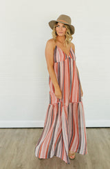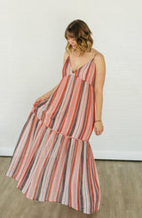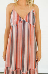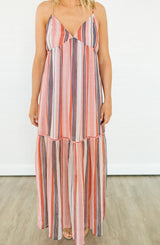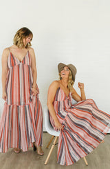 Spring stripes and everything nice! This maxi has all the details that will turn heads and not break the bank. We are loving the stripe pattern and fun ruffle details on the skirt. The thin adjustable straps, v-neckline, and empire waistline are extremely figure flattering. We love this dress paired with simple wedges and necklace. This is a perfect dress to wear to a college graduation, wedding, Mother's Day tea, or brunch with our best girlfriends. Need a bit more coverage, then we love this dress paired with the Amelia denim jacket or our Boyfriend denim shirt tied in a knot!